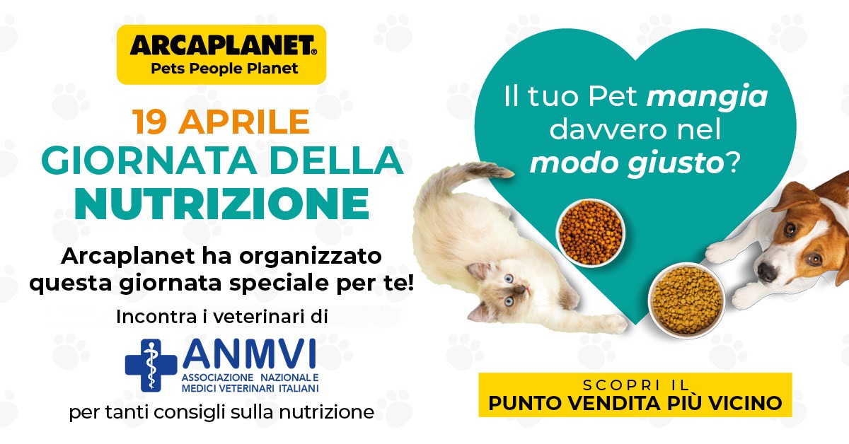 Il 19 aprile celebriamo la Giornata della Nutrizione del Pet, evento realizzato da Arcaplanet con il patrocinio di ANMVI e che coinvolgerà esperti veterinari di tutta Italia. Un’occasione per scoprire come un’alimentazione su misura possa fare la differenza nella vita del tuo animale: perché ogni pet merita il meglio! 🐶🐱