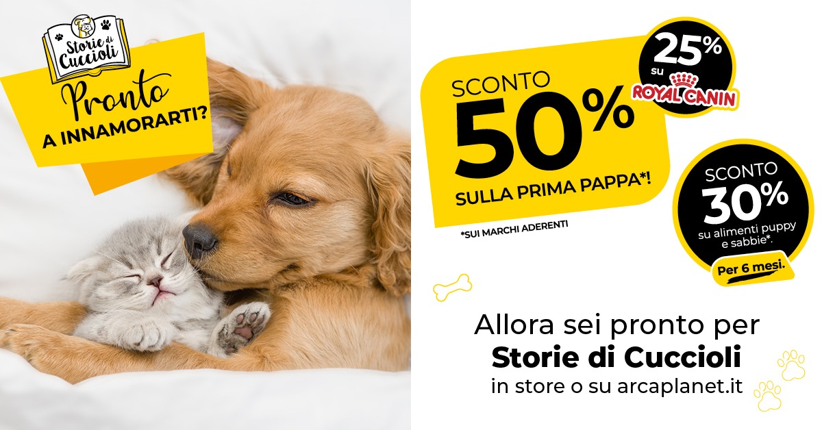 “Storie di Cuccioli” è il programma Arcaplanet dedicato a te cliente Arcacard che hai adottato un piccolo pet, ed è pensato per accompagnarlo nel suo primo anno, dalle prime fasi di vita fino all’età adulta. Iscrivendoti puoi avere accesso a uno spazio completamente tuo in cui trovare contenuti esclusivi, tanti sconti e servizi su misura!